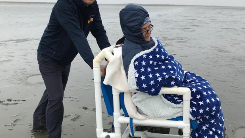 Beim Zwischenstopp in Husum genoss es die schwerkranke 56-Jährige sehr, das erste Mal wieder salzige Luft zu riechen und Schiffe zu gucken. Für unsere Wunscherfüller Andre Bredemeier und Elisabeth Klingenhoff gab es viel zu organisieren, da der Strand in Sankt Peter Ording über Nacht unbefahrbar geworden war. Also entschied man sich für den Südstrand, wo man sehr dicht ans Wasser fahren kann. Die Tourismus-Zentrale sorgte wie so oft sofort nach unserer Ankunft dafür, dass wir kostenlos einen Strandrollstuhl gebracht (!) bekamen und mit dem Wünschewagen noch etwas dichter ans Wasser durften. Ein großes Dankeschön dafür!